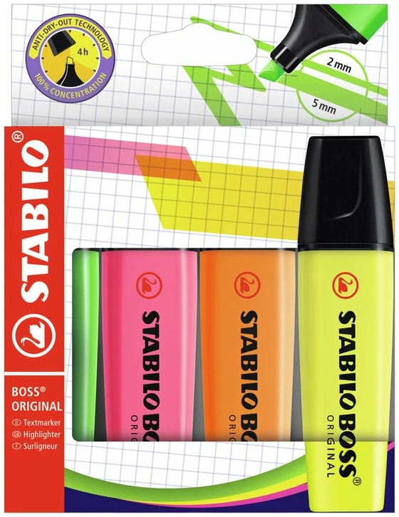 De Stabilo BOSS markeerstiften zijn al sinds hun introductie in 1971 de favoriete en best verkopende markeerstiften van Europa. Deze mooie set bevat 4 neonkleuren.